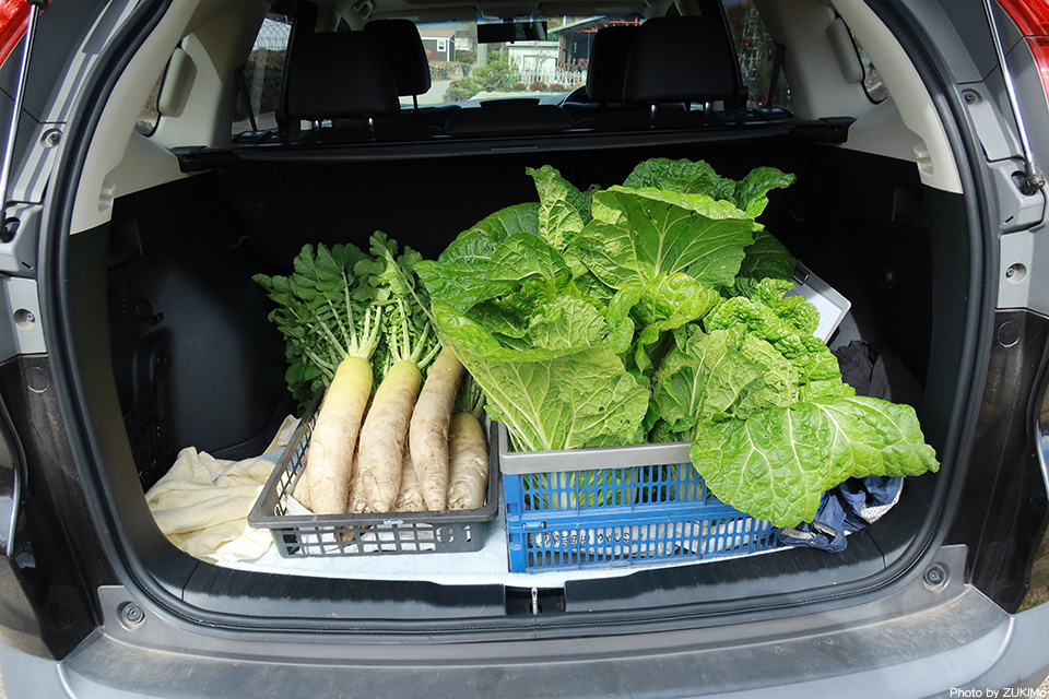 しかし種蒔き時期の天候不順や虫害などで半分ダメになり、追い撒きしたけど大きくならず今年は不作 形の良い大きな物は数本で、今年はちょっと残念な秋の収穫となってしまった。 白菜も大きくはなったものの、まだちょっと密になってなくて・・・ まあ我が家のひと冬分はあると思うけどね そして今度の車はシート倒さずともコンテナ3個なら余裕で積めるのが頼もしいw