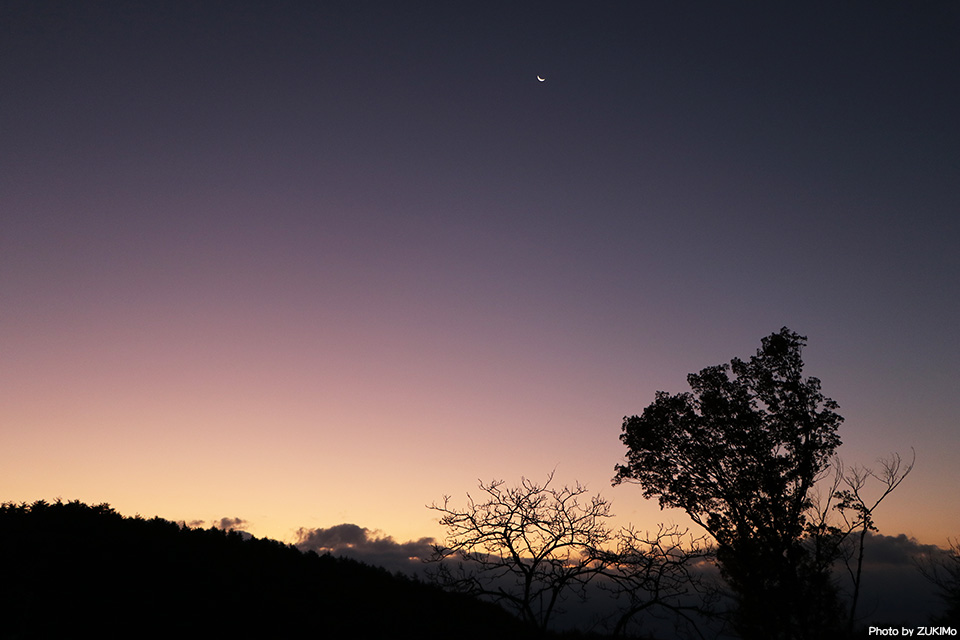 Dawn Purple 逆三日月が浮かぶ朝 美しい景色で穏やかな気持ちで始まった日曜日 しかし某通信会社と某元国営運送会社のあまりにバカなルールから イライラモヤモヤ気持ちで終始した一日 最後に静かな黄昏時のDusk Purpleの空を見て少しは落ち着いた