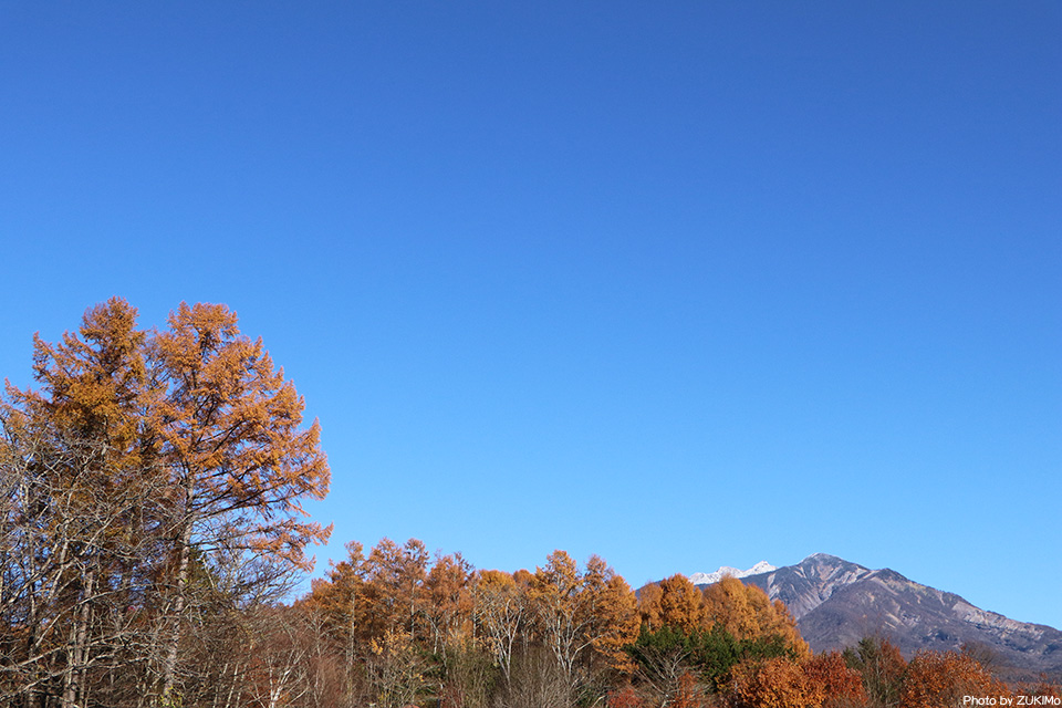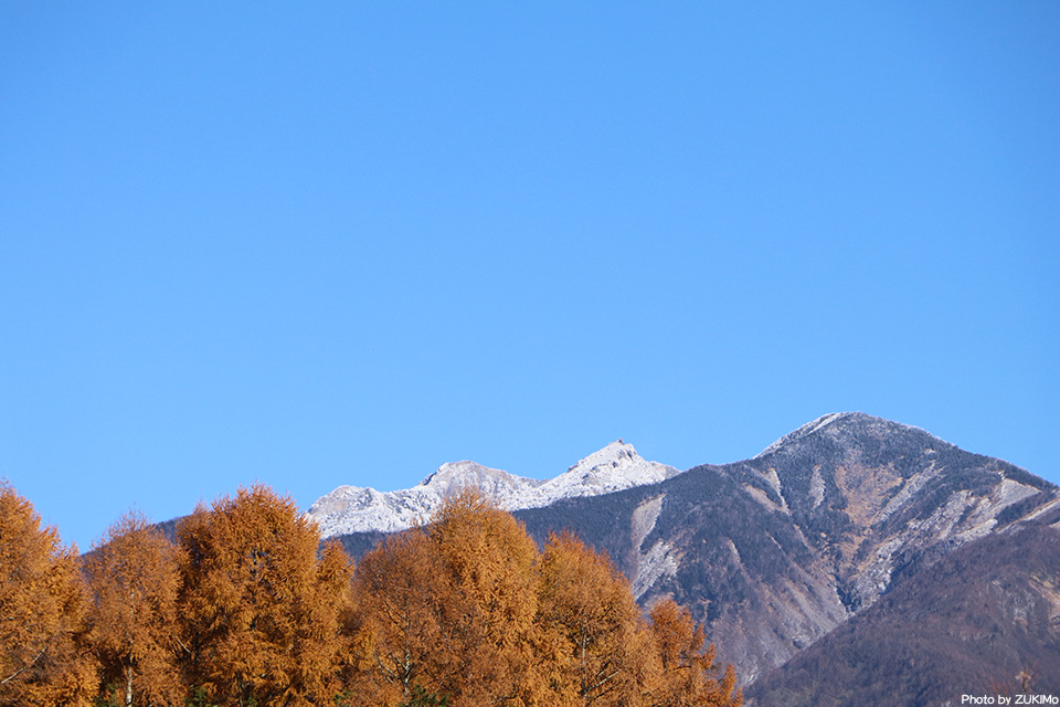 白い権現と黄色のカラマツと快晴の青空が美しい