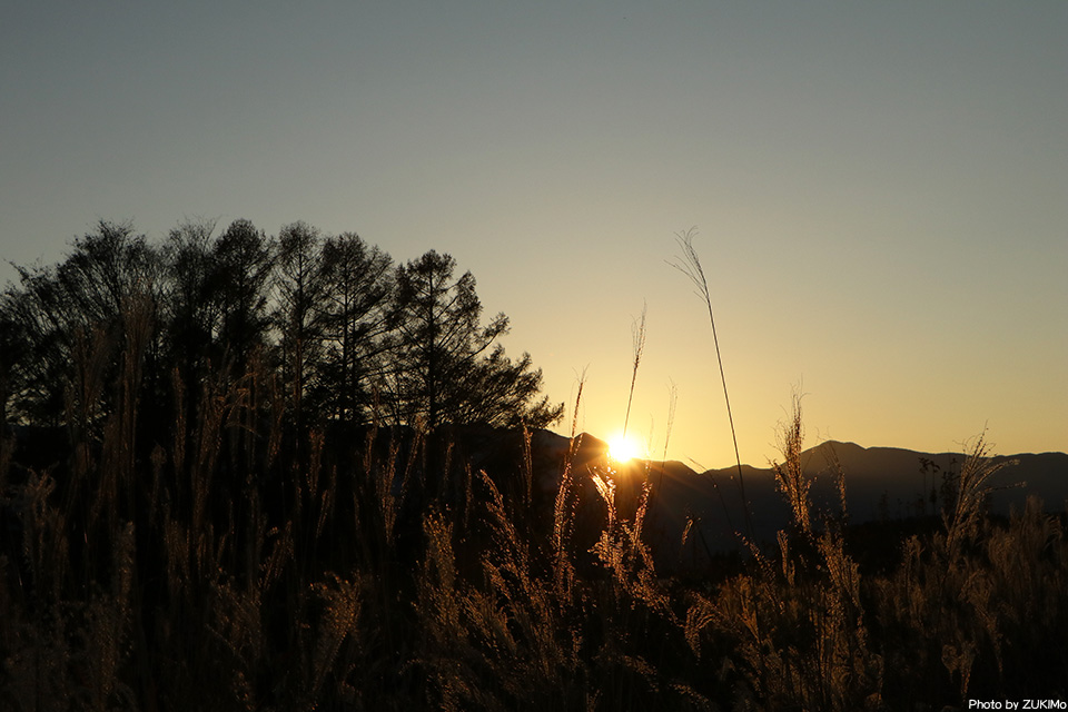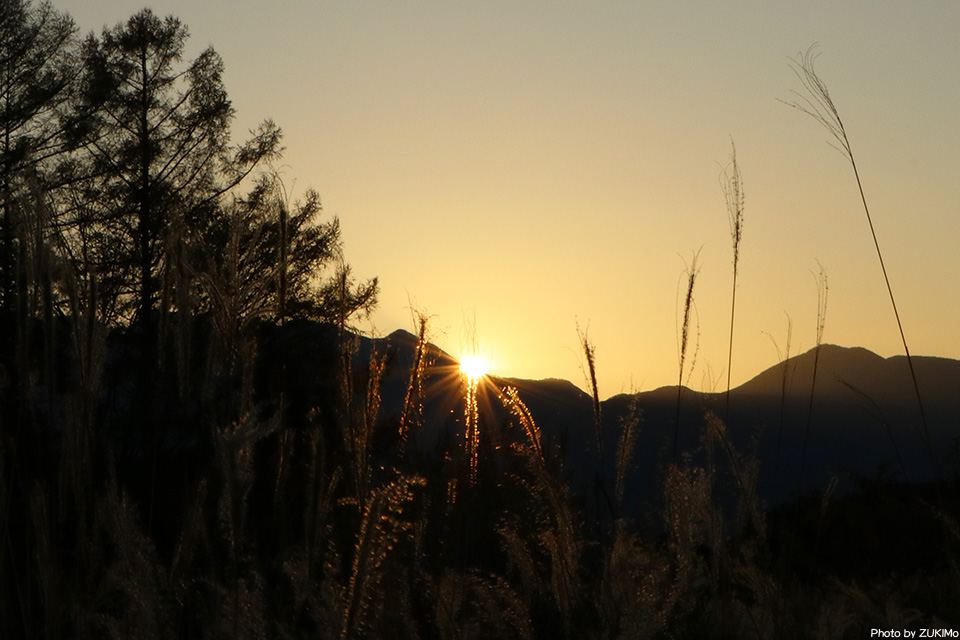 ちょうど山裾に沈む夕日に輝くススキの穂