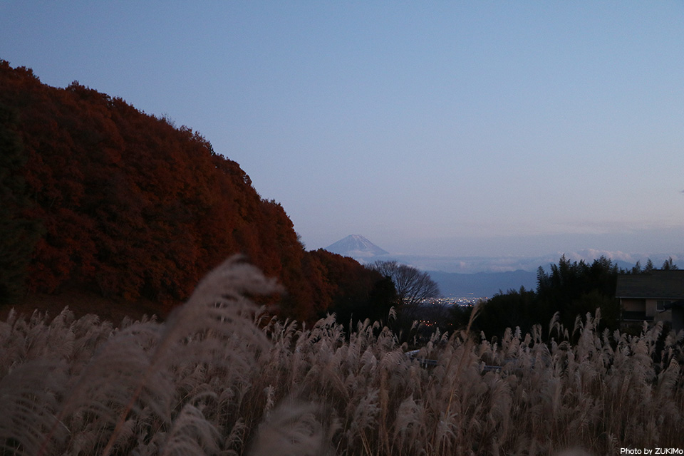 残照に浮かぶ色付く里山と富士山に甲府の灯り