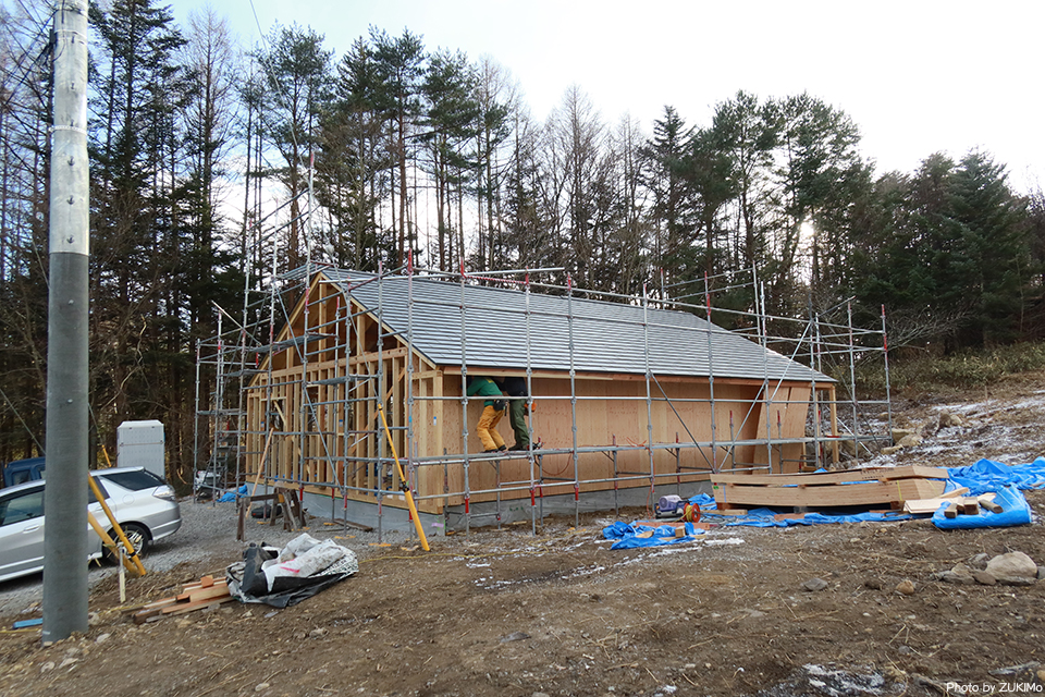 小雪舞う寒空の下、大工さんと施主が一緒に外壁の下地工事もしていた