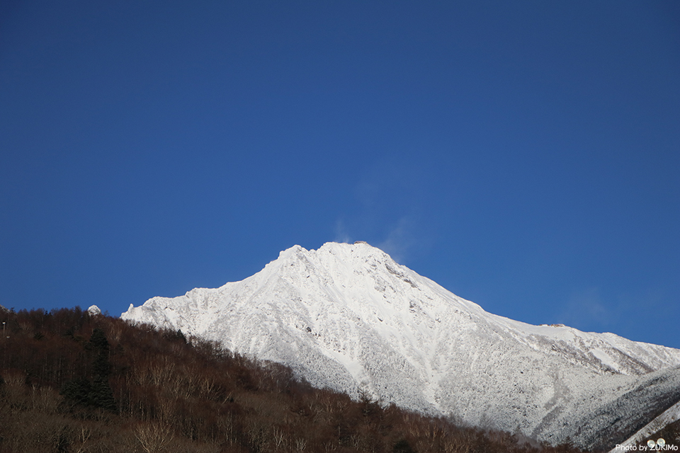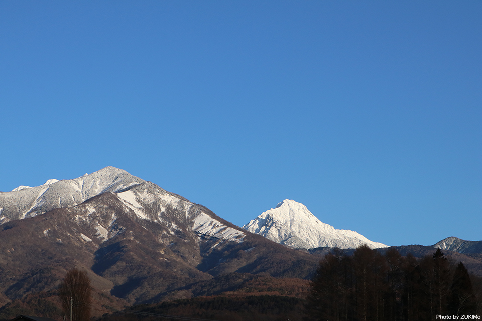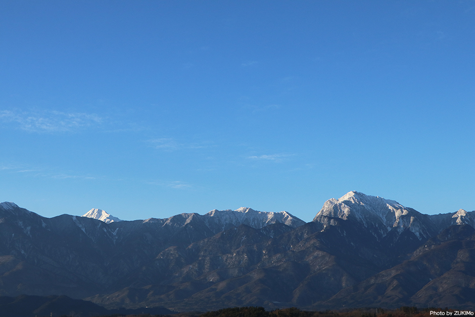 乾燥した空気でスッキリと晴れ渡った空と雪山が美しくて、急ぐ通勤途中に撮らずにはいられなかった。