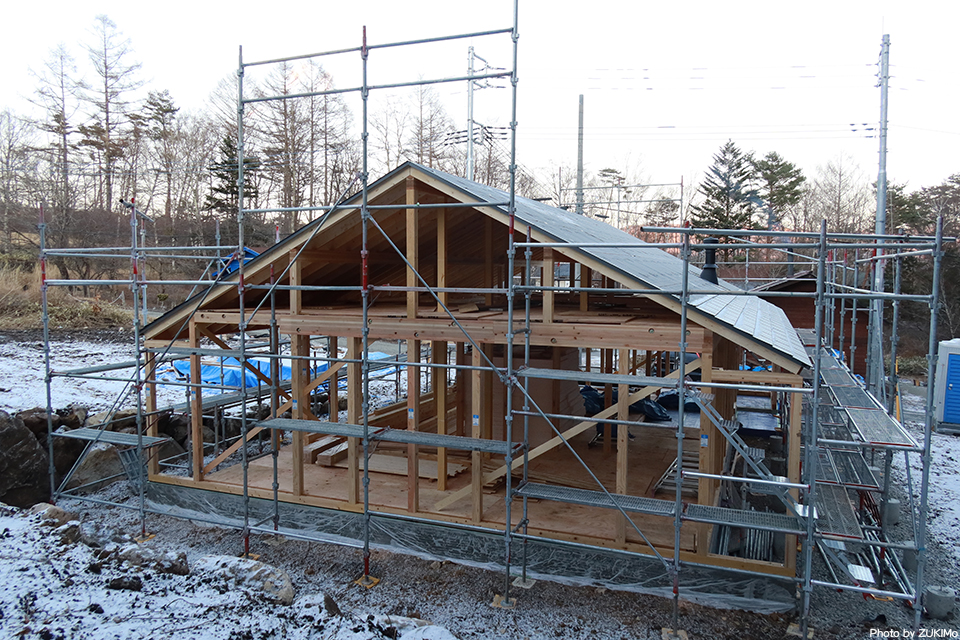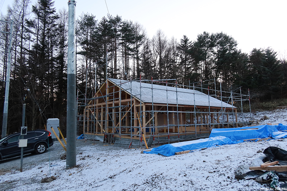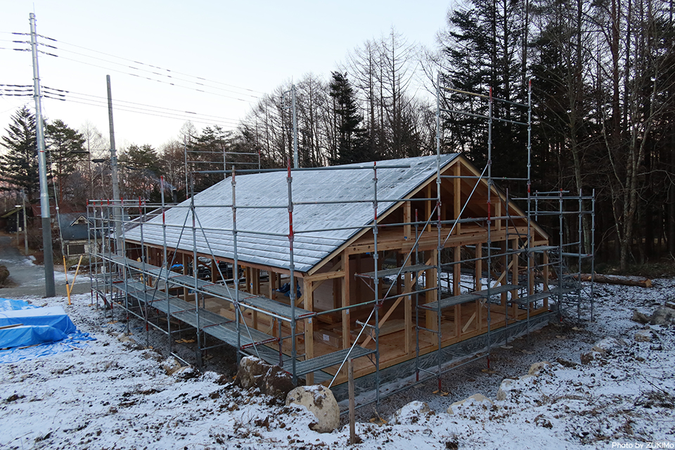 小雪舞う寒空の下、大工さんと施主が一緒に外壁の下地工事もしていた